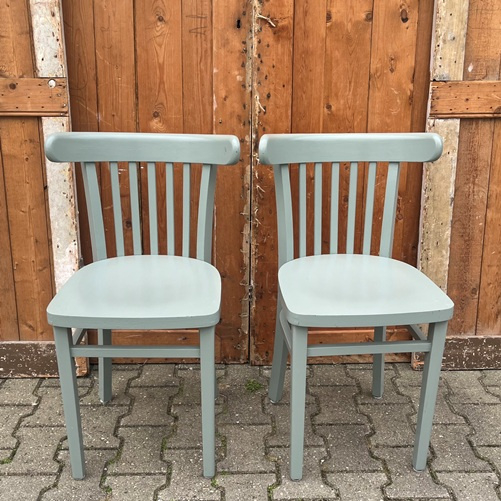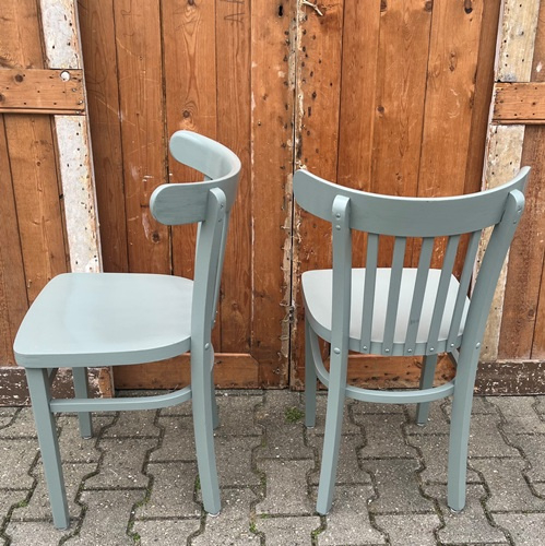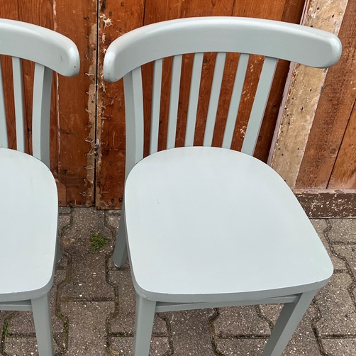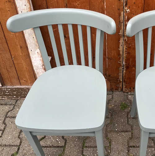 De stoelen zijn geschilderd in de kleur groen / grijs en in goede staat, maar hebben fraaie sporen van gebruik.