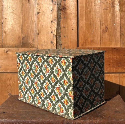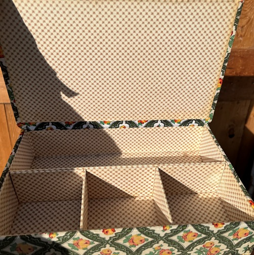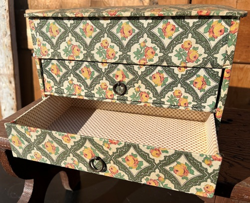 Geweldig voor de verzamelaar / liefhebber: origineel ladekastje met twee laden en klep, voorzien van fraaie stoffen bekleding.
