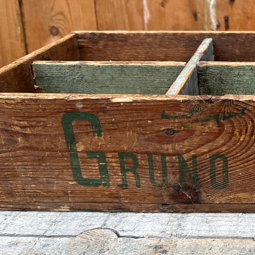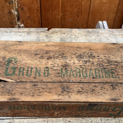 Origineel kistje van Gruno Margarine, met fraaie teksten aan de zijkanten en onderkant.