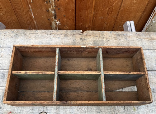 Het kistje is van hout en in goede en originele staat (met sporen van gebruik en mist een stukje uit de bodem).