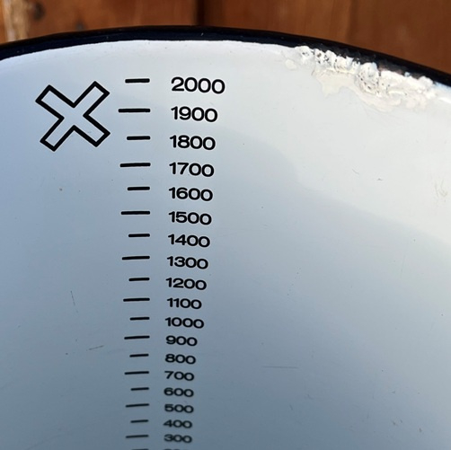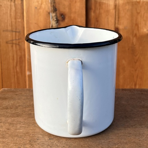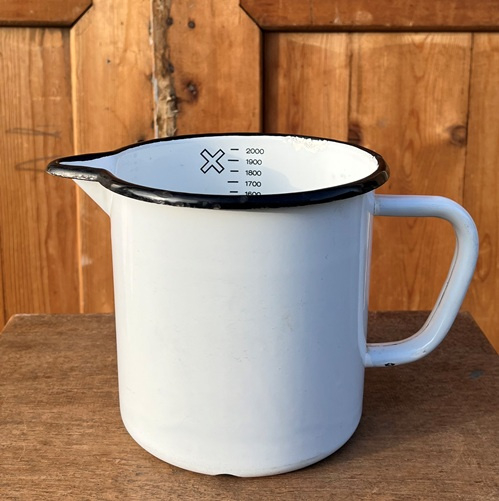 Leuke decoratie voor in uw landelijke keuken: originele emaille maatbeker met inhoud van 2 liter.
