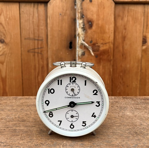 Wekker met opschrift Commodoor.Kleur: wit.Let op: de werking is NIET getest.Perfect voor decoratie.Afmetingen:- diameter: 9,5 cm- dikte: 5 cm