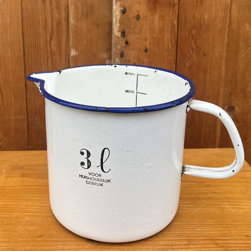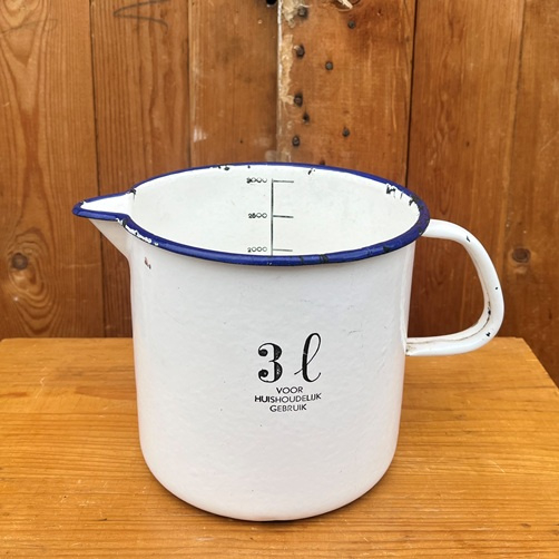 Leuke decoratie voor in uw landelijke keuken: originele emaille maatbeker met inhoud van 3 liter.