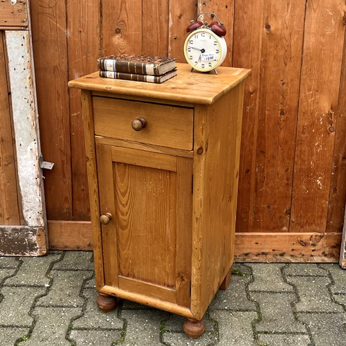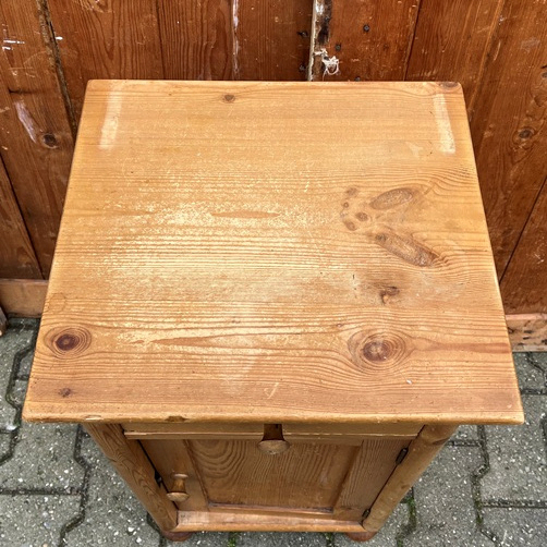 Prachtig en origineel halkastje / nachtkastje van grenen hout met deurtje, lade en schap.