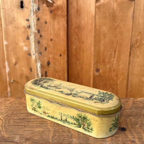 Leuk en origineel lepeldoosje / lepelblikje van. Douwe Egberts. Uitgegeven in 1954 als spaarartikel voor Pickwick thee. Het blik is in goede staat, maar heeft sporen van gebruik. Voorzien van afbeeldingen van een oude stad,…