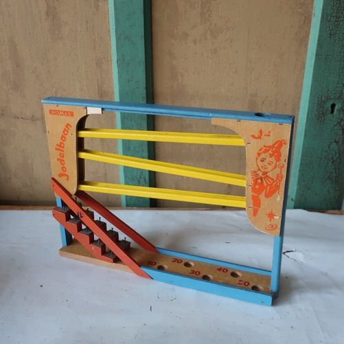 Originele knikkerbaan / jodelbaan van Homas van hout, inclusief 5 oude knikkers (niet afgebeeld). De knikker gaat bovenin en rolt zo over de gele latten naar beneden en over een trapje met metalen xylofoon plaatjes. Dan komt de…