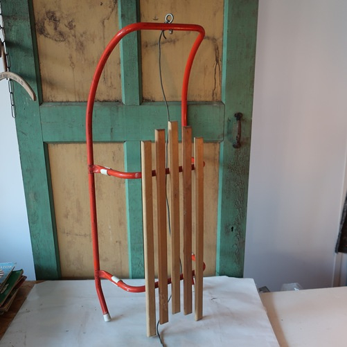 Fraaie en originele kinderslee slee van metaal met houten latten. Zeer fraai vintage / retro exemplaar. Goede staat, maar heeft sporen van gebruik. Afmetingen: - lengte totaal: 91,5 cm - lengte zitting: 55 cm - breedte zitting: 21…